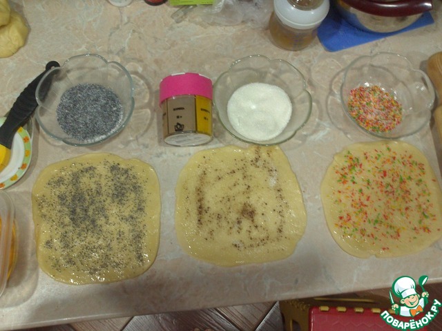 Начинки я сделала разные: 2ч. л. сахара+2ч. л. мака; 2ч. л. сахара+2ч. л. стружки кокосовой (у меня дома оказалась только разноцветная стружка, но так получилось веселее) и просто 4ч. л. сахара (но я не удержалась и добавила немного корицы, не могу без нее).