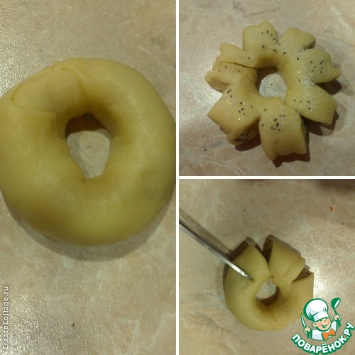 Далее "Ромашка". Ну тут совсем уж просто. Свернуть рулетик, тщательно соединить края, чтоб круг получился и надрезать ножницами (можно и ножом но ножницами гораздо легче и быстрее). Сверху я еще посыпала сахаром и маком.