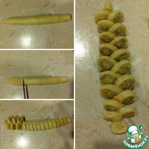 Ох, а это чудо я назвала "Елочка". Мне показалось она сложной, но на деле все очень просто. Единственное я пожалела что сделала длинный рулетик. На елочку нужно сделать поменьше, чтоб была уж точно похожа на елку))) Итак, квадратик свернуть в рулетик и разрезать ножом почти до края, чуток не дорезая. Затем каждую часть в стороны раскладывать. Верхушку я сделала как верх елочки, а низ как пенечек. Думаю если бы была елочка потолще, было бы гораздо красивее. В следующий раз я обязательно так сделаю и добавлю фото в комментарии. Елочку я посыпала своей разноцветной кокосовой стружкой). И еще один важный момент - "Елочку" нужно делать на небольшом кусочке бумаги для выпечки, иначе потом будет тяжело переложить на противень.