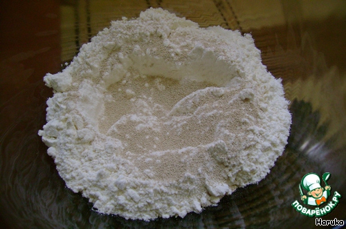 Приготовить дрожжевое тесто опарным способом. В посуду засыпать 1/3 муки, добавить дрожжи, перемешать.