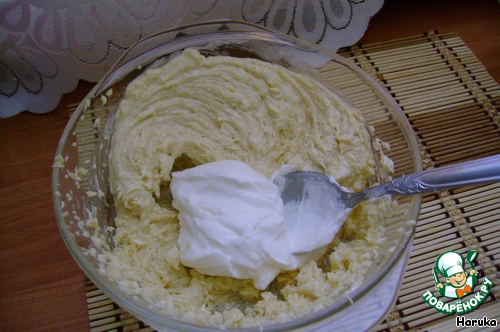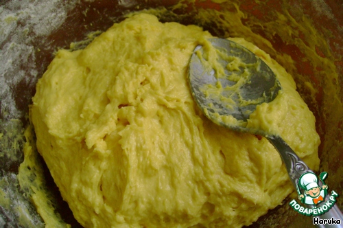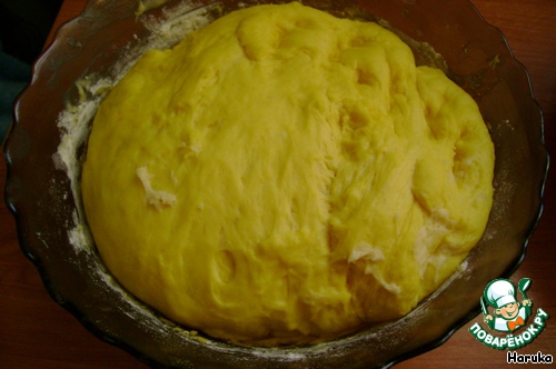 Когда опара удвоится в объеме, к ней добавить взбитое сливочное масло с сахаром, желтками, сметаной, шафраном, солью. Затем добавить муку и месить тесто до тех пор, пока тесто не станет отделяться от стенок посуды.