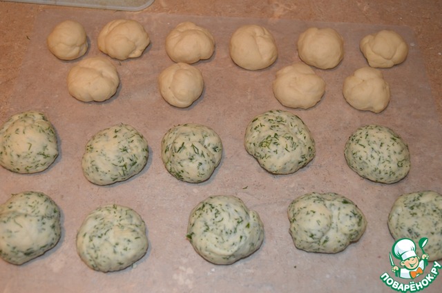 Обычное тесто и тесто со специями разделить наа 10 частей и скатать их в шарики. Накрыть полотенцем и дать постоять 15 минут.