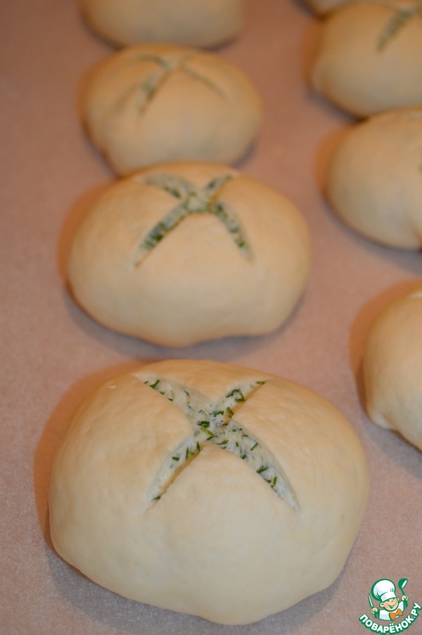 Противень застелить пергаментом и выложить на него шарики швом вниз. Сверху сделать крестообразные надрезы. Накрыть полотенцем и оставить на 30-40 минут.