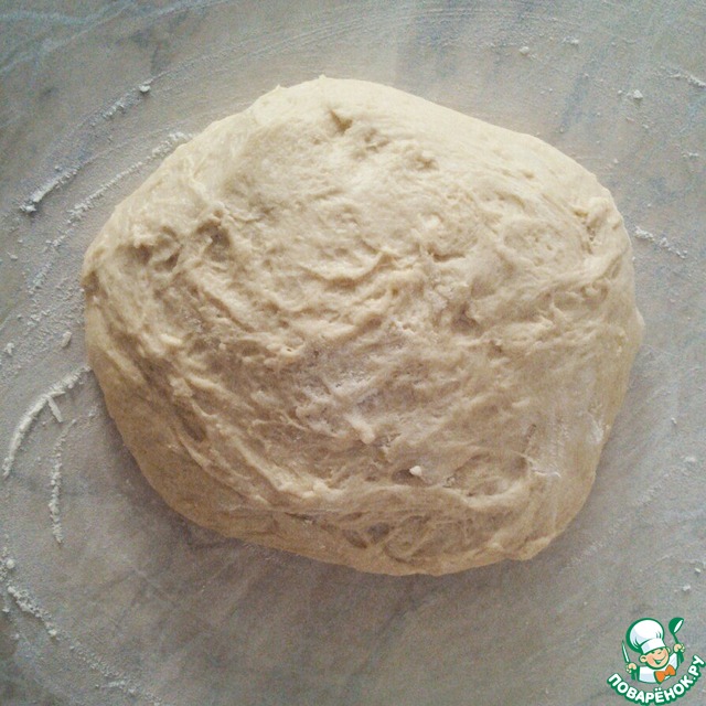 Добавляем остальное масло и муку (сколько возьмет тесто - около 2 стаканов) и замешиваем тесто. Перекладываем в емкость, смазанную маслом. Накрываем полотенцем и ставим в теплое место часа на 2. Как только тесто подойдет, переложить на присыпанную мукой поверхность и обмять.