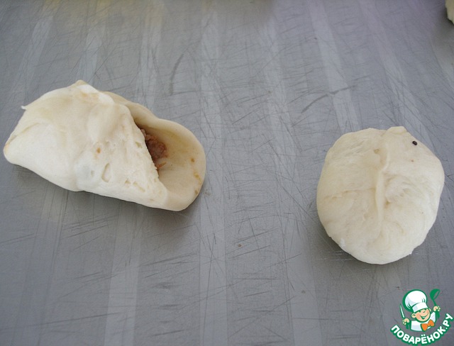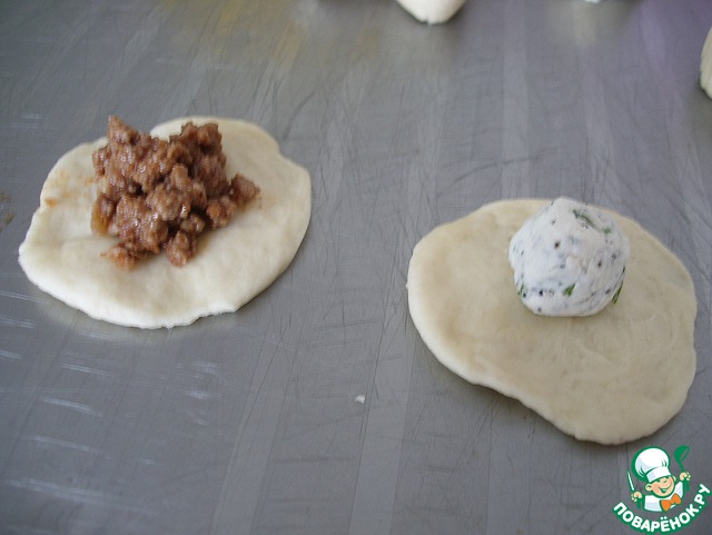 Каждую часть руками размять в небольшую лепешку, выложить немного начинки.