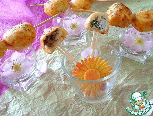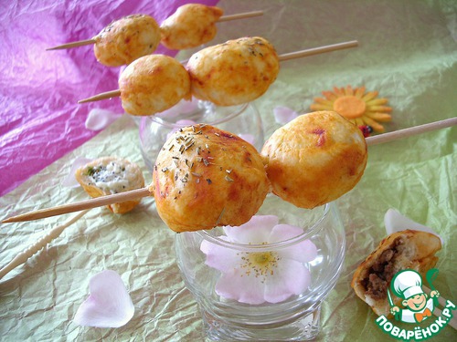 | Предлагаю, в ожидании приготовления настоящих шашлыков, закусить мини-шашлычками из сдобы с мясной и сырной начинкой. Вкусно и оригинально! |