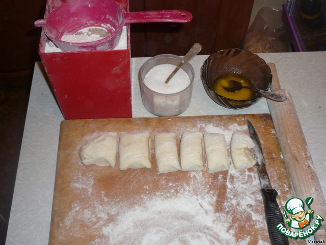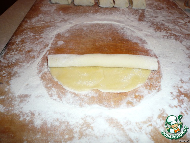 Раскатываем из дольки кружок. Тонко, но не сильно. Сверху смазываем маслом, посыпаем сахаром. Можно присыпать корицей или маком, или чего душа попросит.