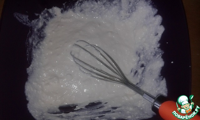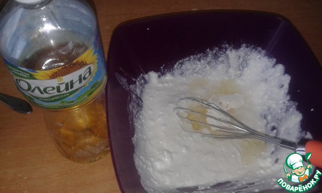 Яичные белки слегка взбить венчиком с сахаром, добавить творог, кефир и хорошо перемешать