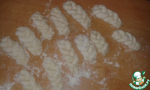 Разделить тесто на 12 частей. Теперь каждую из полученных частей делим еще на 3, и делаем жгутики