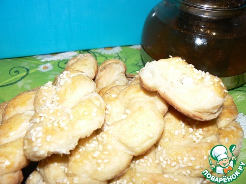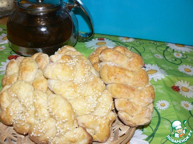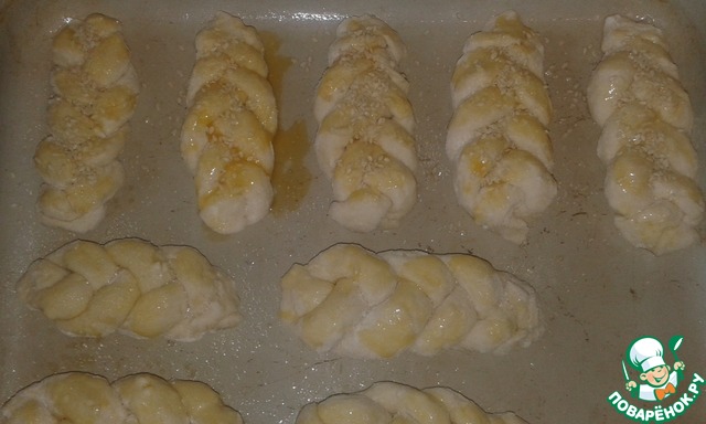 Противень смазать растительным маслом, выложить булочки, смазать желтком, посыпать сахаром и по желанию кунжутом. Выпекать при 175 градусах около 20 минут
