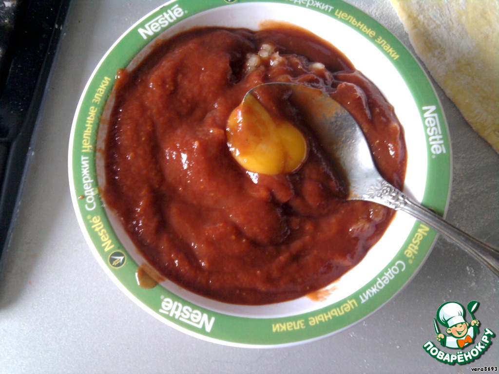 Яичный желток взбить с кетчупом и добавить измельченный чеснок.