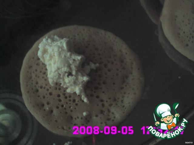 Кладем начинку на середину оладушка с не обжаренной стороны.