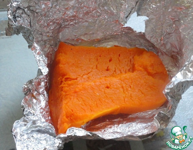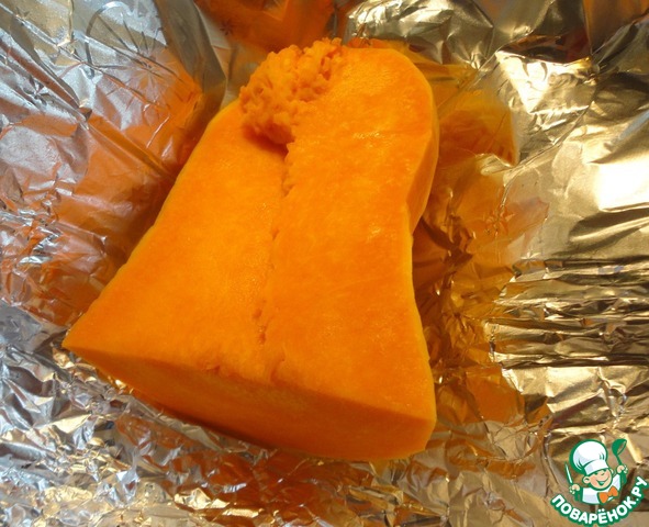 Тыкву чистим, отрезаем кусочек около 150 гр, заворачиваем в фольгу. Отправляем в разогретую до 180-200 градусов духовку.