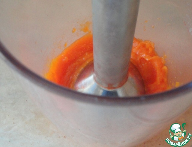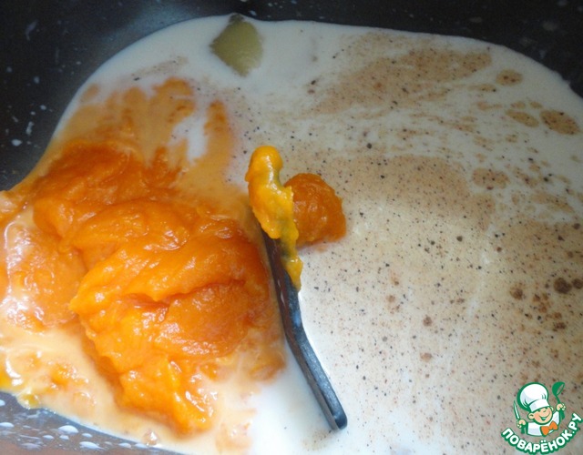 Добавляем тыквенное пюре, по щепотке соли и мускатного ореха, чайную ложку меда.