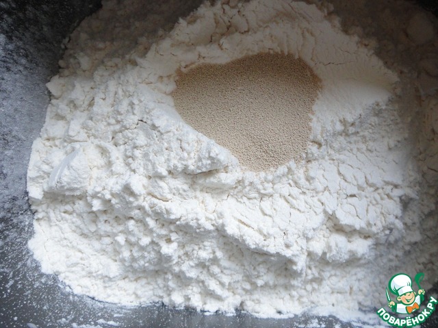 Далее добавляем просеянную муку и дрожжи. Ставим в ХП в режим "Дрожжевое тесто"