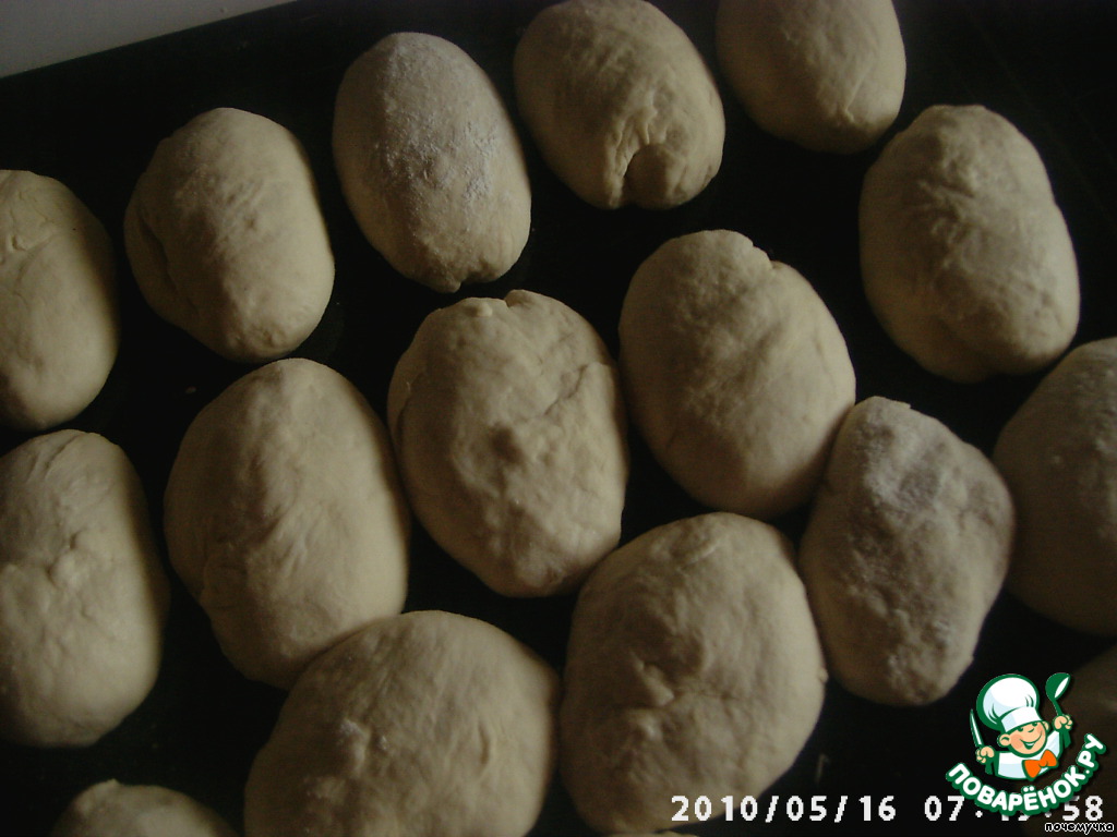 После выбраживания тесто вываливается на припыленный мукой стол, разделывается на 18 частей.