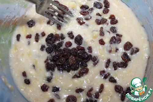 Изюм вымыть, обсушить, добавить к бананам. Плюс корицу и соду.