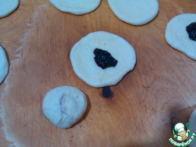 Из теста раскатать небольшие кружочки. На центр каждого положить 1 ч. л. варенья и защипнуть края так, чтобы начинка оказалась внутри.