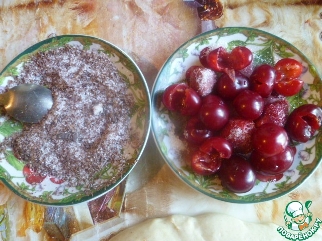 У меня две начинки: черешня ( я вынула косточки) и немного клубники. А еще горький шоколад я натерла на крупной терке и смешала с сахаром.
