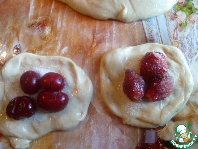 Отрываем кусочек теста, делаем лепешку. На середину кладем 1 ст. л. сахара и сверху черешню или клубнику.