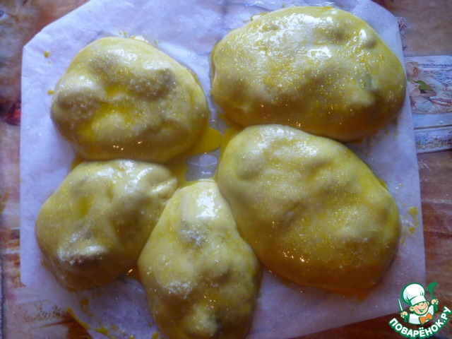 Смазать взбитым желтком с 18 мл ( 1 ст. л.) молока и посыпать сахаром.