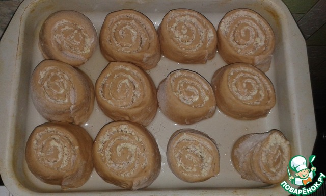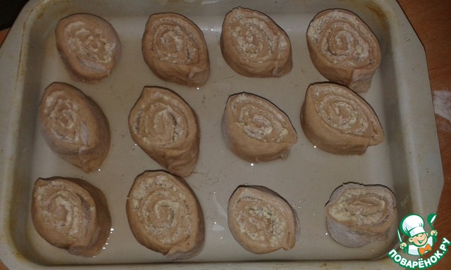 Разрезать острым ножом на 12 частей и уложить на расстоянии друг от друга в форму, смазанную растительным маслом