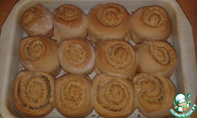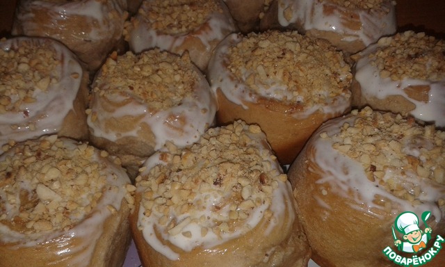 Готовые горячие булочки, помазать кисточкой глазурью и посыпать орешками. Приятного аппетита!