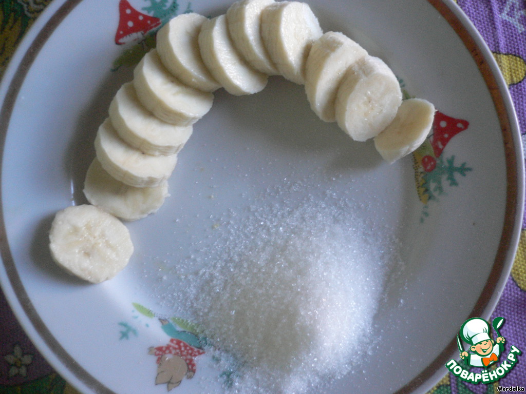 Нарезать банан кружочками. Насыпать немного сахара.