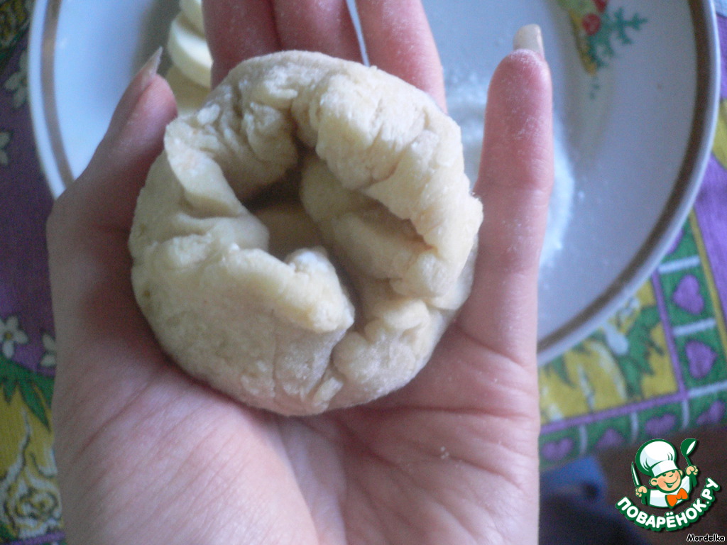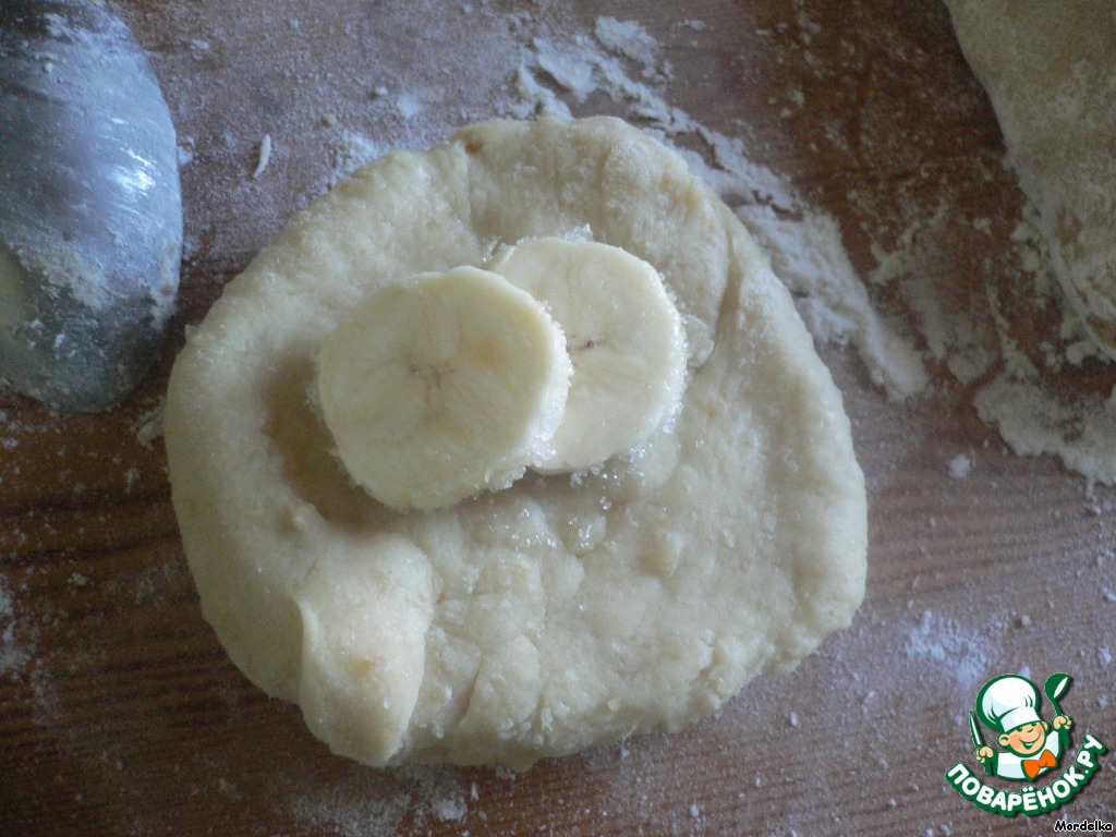 "Отрываем" от теста небольшой кусочек-шарик, делаем из него лепёшку (руками или скалкой). Банан обваливаем в сахаре.