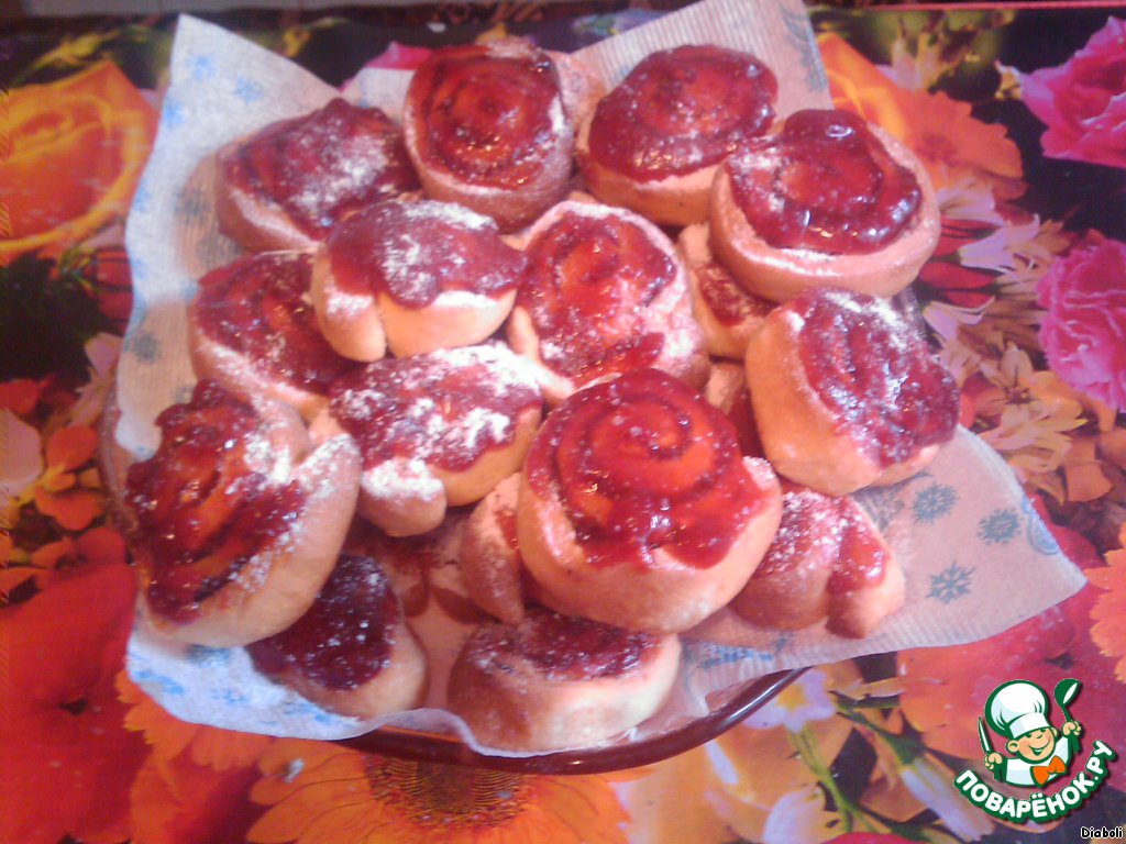 Оставшееся повидло развести 2 стол. ложками воды и вскипятить. Готовые булочки смазать и посыпать сахарной пудрой.