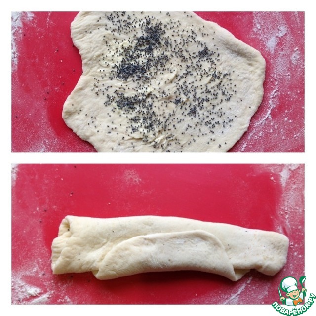 Тесто разделить на небольшие шарики, каждый раскатать достаточно тонко. Смазать мягким сливочным маслом и посыпать маком.