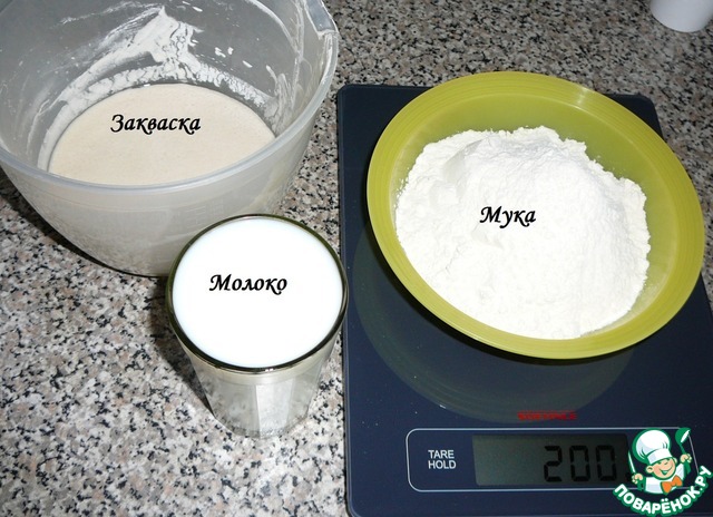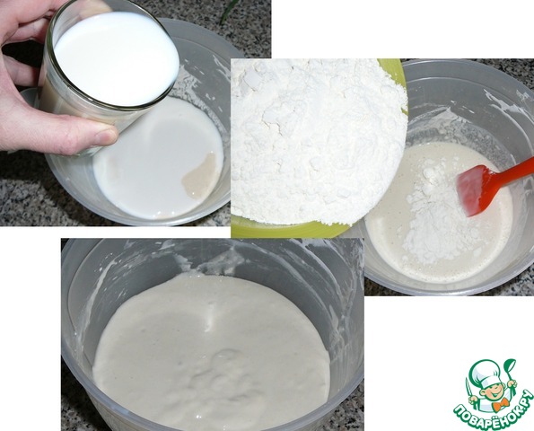 В домашнюю закваску, предварительно постоявшую при комнатной температуре 30 минут, добавим часть молока, перемешаем хорошенько. Затем, добавляя то муку, то молоко, перемешиваем до однородного состояния.