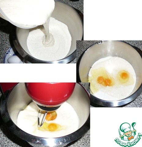 Добавляем закваску, яйца и начинаем замешивать тесто.