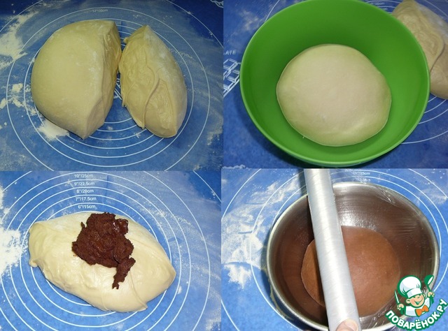 В одну треть теста добавляем шоколадную смесь и вымешиваем до однородного состояния. Затем так же убираем в миску, накрываем пленкой и оставляем расстаиваться на 2-2,5 часа.