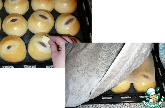 Булочки укладываем на противень (можно использовать пергаментную бумагу или силиконовую подложку), смазываем желтком смешанным с 1 ст. л. молока, делаем по надрезик, и, отправляем в духовку.