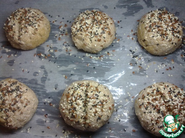 Тесто разделить на части и круговыми движениями скатать шарики ( у меня получилось 6 булочек), на булочках по середине сделать надрез. Булочки я смазала водой и обсыпала кунжутом и семенами льна (по желанию). Противень застелить пергаментом и смазать растительным маслом, выложить булочки накрыть полотенцем и оставить на 30 минут.