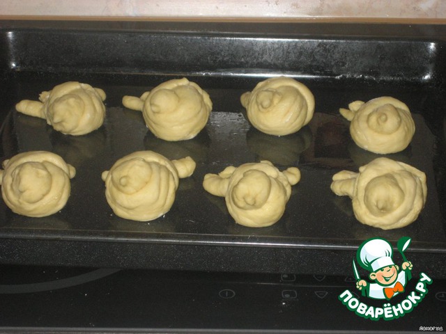 Уложить птичек на смазанный маслом противень, дать булочкам подняться, после чего смазать растительным маслом для золотистого цвета.