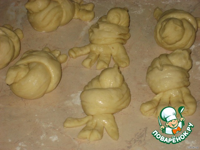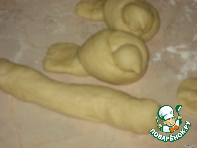 Выложить тесто на посыпаную мукой доску, хорошо вымесить. Тесто должно быть довольно плотным, чтобы после расстойки птички не потеряли форму. Разделить тесто на кусочки (8 шт.). Каждый кусочек раскатать в лепешку.