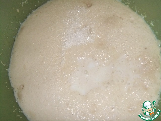 В 100мл теплого молока, добавляем 1ч. л. сахара и дрожжи, оставляем на 15 минут, чтобы дрожжи "ожили".