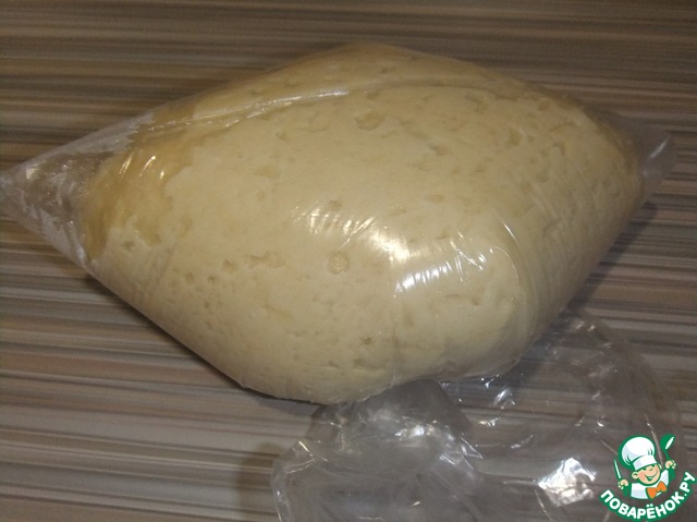 Тесто мягкое, эластичное, немного липкое. Перекладываем тест в пакет и убираем в холодильник на 1,5 часа