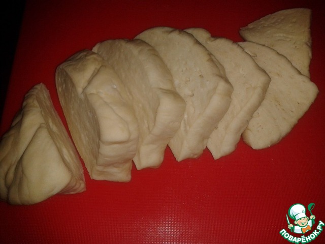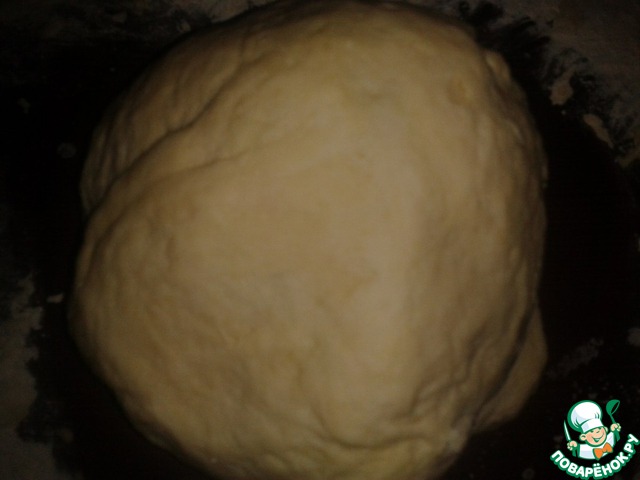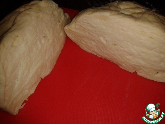 Переложите тесто на чуть присыпленную мукой поверхность и вымешивайте тесто еще пару минут. Разделите тесто пополам.