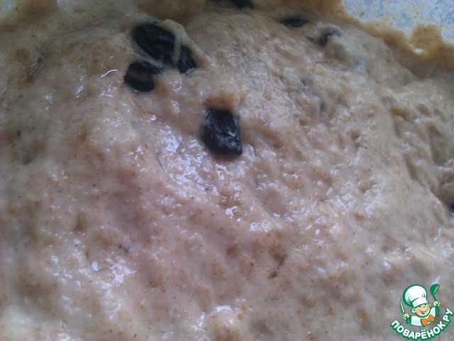 Добавляем муку и изюм. Все тщательно смешиваем. Тесто должно получиться мягкое, но достаточно густое, чтобы Вы смогли лепить из него.