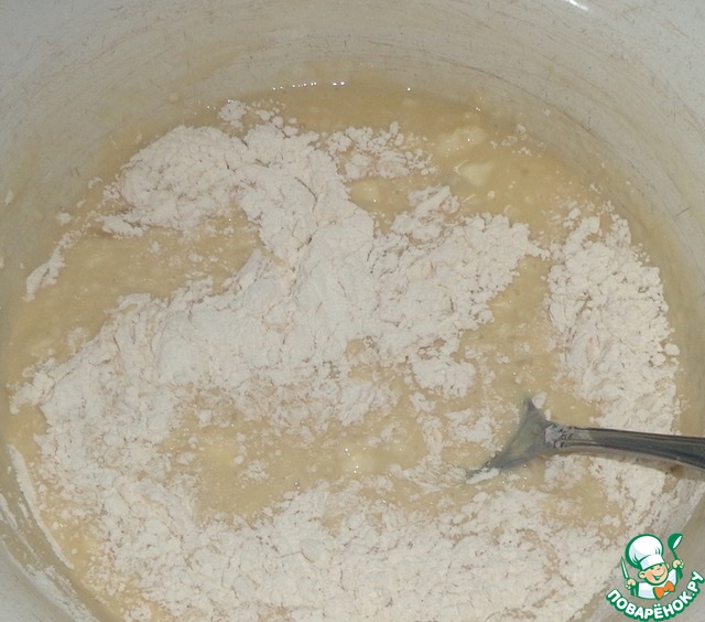 Муку просеиваем через мелкое сито и добавляем небольшими порциями в тесто. Замешиваем не слишком крутое тесто. Его помещаем в блюдо и накрываем, ставим в теплое место на 1,5-2 часа.