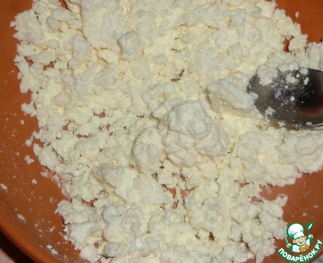 Для начинки я использовала домашний творог, он у меня крупинками. Творог смешиваем со сметаной и разминаем ложкой.