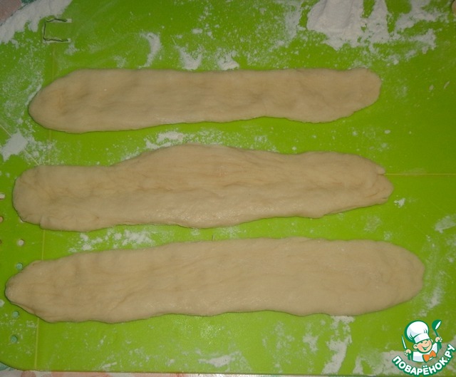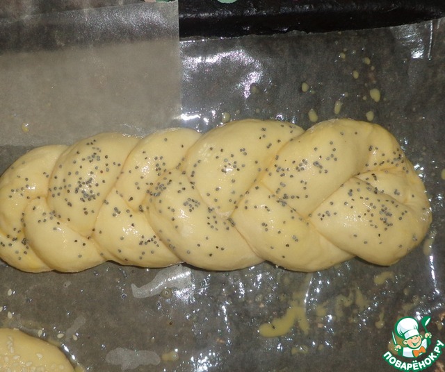 Защипываем полосочки и заплетаем косичку. Кладем ее на противень, смазываем желтком и посыпаем маком. Желток я смешиваю с небольшим количеством воды, чтобы он стал реже.