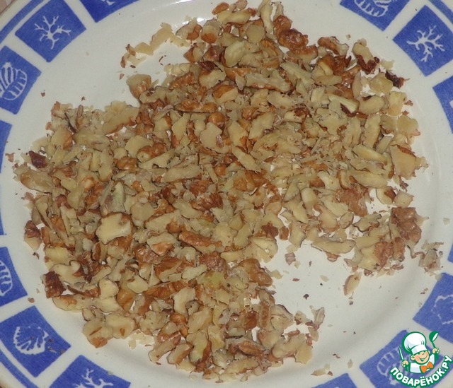 Подготовим начинку. Грецкие орехи немного измельчить, у меня они вот такие. По желанию можно измельчить их с помощью кофемолки в крошку. Орехи смешиваем с жидким медом и перемешиваем. Начинка готова.