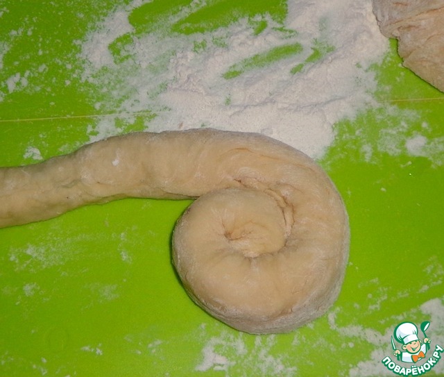 По всей длине полоски распределяем ореховую начинку и защипываем. Сворачиваем "улитку".