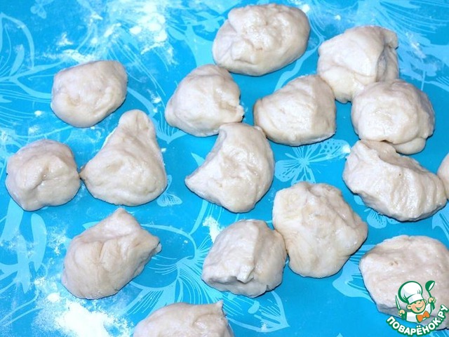 Переложите тесто на припыленную мукой поверхность стола и вымесите его несколько раз. Разделите тесто на 16 кусочков