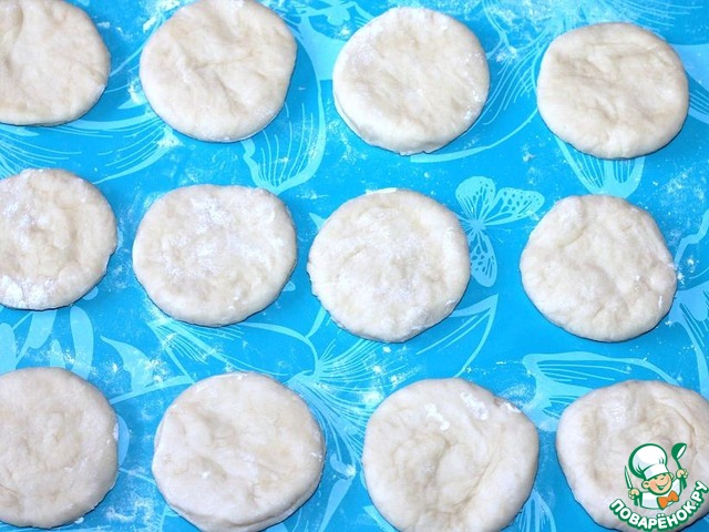 и раскатайте в лепешки размером с кофейное блюдце. Вырежьте кружочки Ф = 6 см.