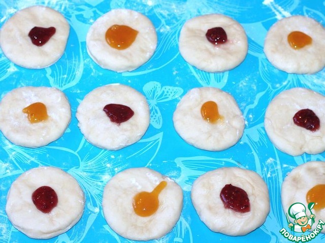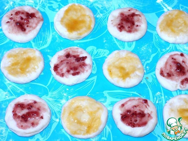 Я решила улучшить вкус и приукрасить булочки. Для этого взяла джем и положила по большой капле в середину каждого круга.